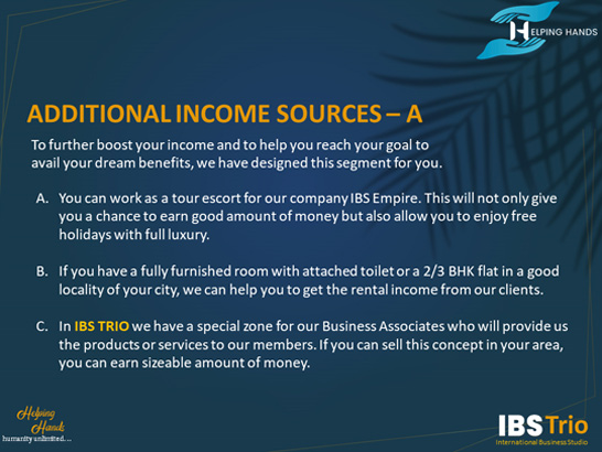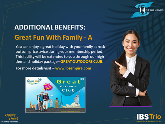 People are ready to work hard to live a comfortable life but the financial strain holds them back to achieve their targets. IBS Trio is a well designed triangle comprising of the company, you and the unlimited opportunities.