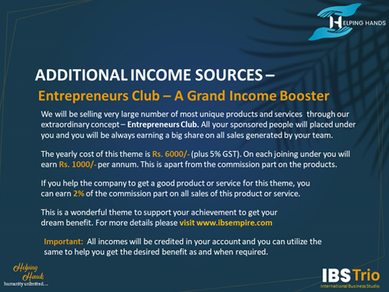 Apart from a wonderful multidimensional package we are creating well designed income opportunities. In fact, we wish to create a very large family through all these packages so that we can design endless ideas to extend continued benefits to our family members.